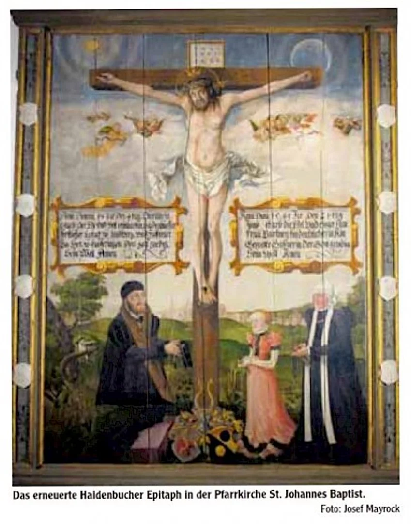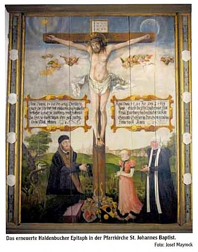 Das Bild zeigt vor einem Kruzifix Reinhardt Haidenbucher, der in der zweiten Hälfte des 16. Jahrhunderts königlich bayerischer Beamter und Hofmarkherr in Kaufering sowie Kastner (Kämmerer) in Landsberg war, dessen erste Frau Barbara und die gemeinsame Tochter. Josef Mayrock betrieb Ahnenforschung. Dabei stellte er fest, dass Reinhardt Haidenbucher nach dem Tod seiner Frau Barbara am 21. Juni 1565 ein weiteres Mal heiratete. "Von dieser Frau wissen wir nichts, außer dass sie fünf Kindern das Leben schenkte - darunter den Zwillingen Maria Salome und Maria Cleophe", sagt Josef Mayrock.